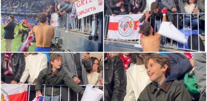 比赛结束后,马科斯-略伦特专门走向看台,将自己的球衣送给了一位特意为他制作了标语的小男孩。孩子得到球衣后,和略伦特的拥抱以及他脸上的幸福笑容,令人感动。