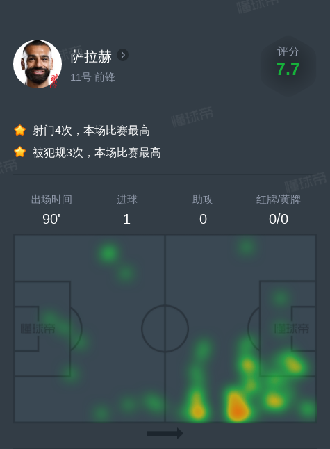 北京时间1月6日利物浦vs曼联,萨拉赫贡献1球,2次关键传球,4次射门,2次成功过人。
