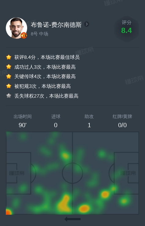 北京时间1月6日利物浦vs曼联,布鲁诺-费尔南德斯1助攻,4次关键传球,2次射门,3次成功过人。