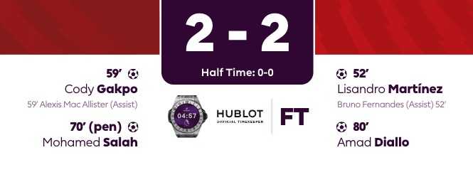 此役客场对阵利物浦,替补登场的加纳乔在第80分钟送出倒三角传中,由阿马德-迪亚洛破门扳平比分,最终曼联2-2战平对手,拿到1分。