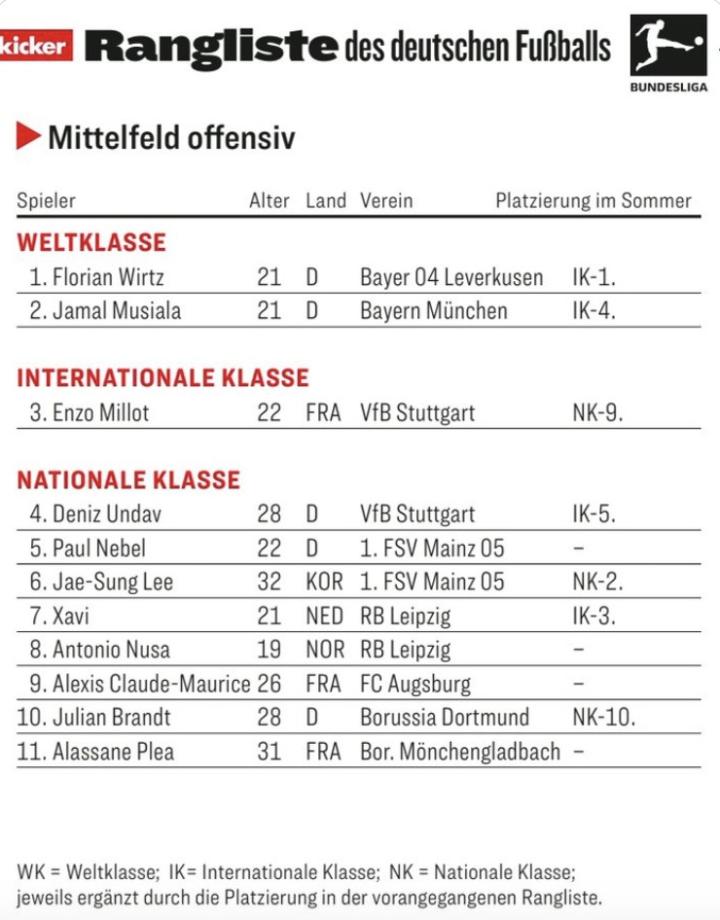 德甲联赛半程战罢,德国媒体《踢球者》对本赛季德甲半程进攻型中场球员的表现进行了评级。其中,维尔茨、穆西亚拉获评世界级。