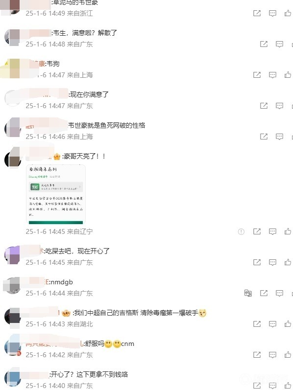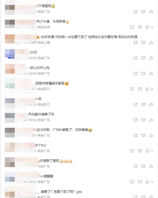 北京时间1月6日,中国足协公布了2025赛季职业联赛准入资格,广州队未在列。此前韦世豪曾在微博公开质疑广州队是如何过的准入(当时广州队并未过准入,而是通过清欠),引来球迷的骂声。今日在足协公布准入名单后韦世豪的微博评论区再次“沦陷”。