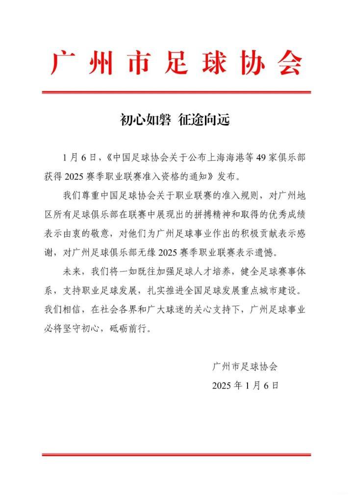 1月6日,中国足协官方公布了2025赛季职业联赛准入资格名单,广州队无缘。随后,广州市足协官方撰文回应了此事。
