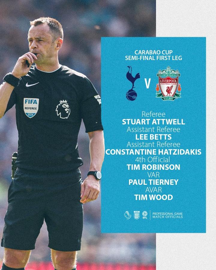 北京时间1月7日凌晨,英格兰职业裁判公司(PGMOL)公布了英联杯半决赛首回合的裁判安排,其中约翰-布鲁克斯将执法阿森纳对阵纽卡的比赛,而阿特维尔将执法热刺对阵利物浦的比赛。