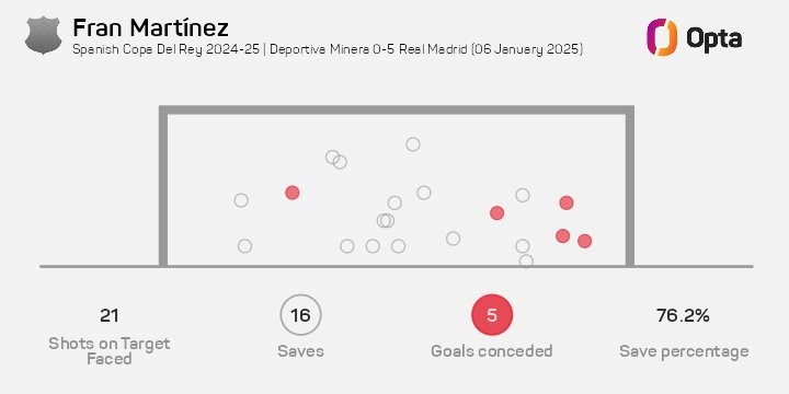 此役对阵皇家马德里,首发出战并打满全场的米内拉体育门将弗兰-马丁内斯面对21次射正,做出了16次扑救,最终丢了5球。