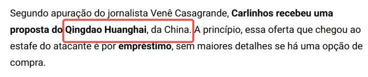 该巴西媒体表示,弗拉门戈前锋卡利尼奥斯收到青岛黄海(后青岛队,已解散)的租借报价,但不知道是否含有买断条款,卡利尼奥斯目前并未接受报价。