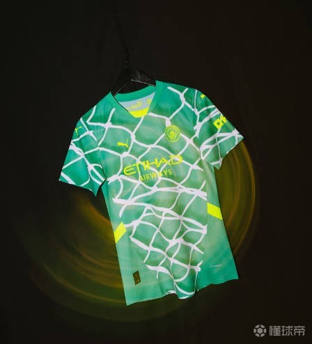 曼城24-25赛季AI设计的门将球衣灵感来自球门上的网,球衣底部为绿色,四周布满网状图案,所有标志均为醒目的黄色,据悉,这款球衣将限量发售。