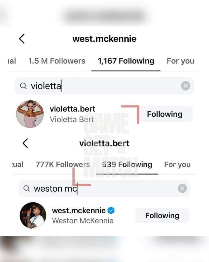 麦肯尼和维奥莱塔-伯特从去年10月开始在社交媒体上互相关注,并一直在对方的帖子上互相点赞。最近,两人都在网上分享了在阿尔卑斯山度假的照片,之后麦肯尼迅速从自己的账户上删除了照片。