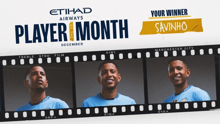 官方消息,萨维尼奥当选曼城12月最佳球员。