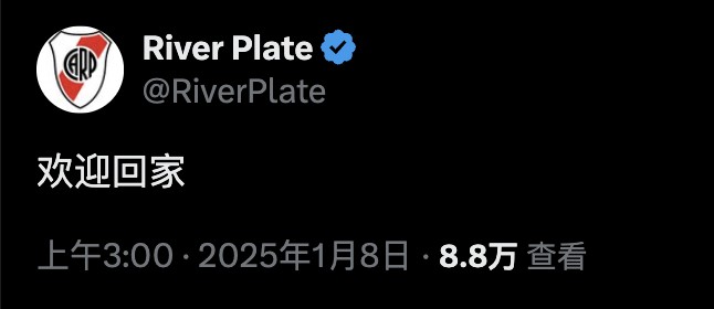 河床官方宣布卢卡斯-马丁内斯回归俱乐部,在预热官宣时用了中文“欢迎回家”。