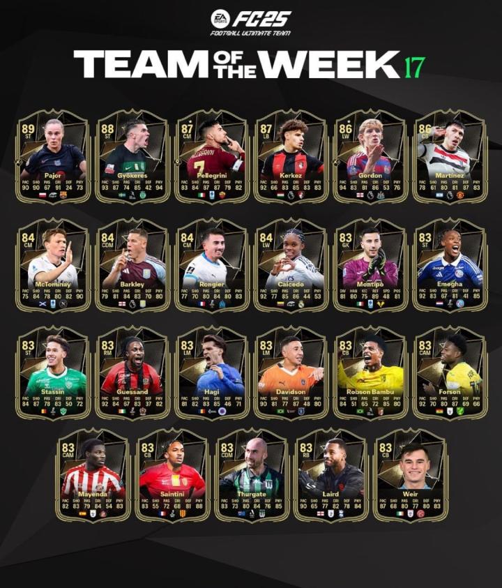 《FC25》刚刚发布了第17周周黑,哲凯赖什、佩莱格里尼、利桑德罗-马丁内斯、安东尼-戈登在列。