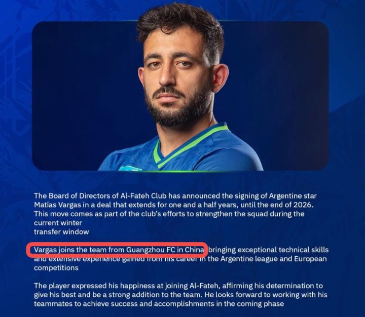 北京时间1月9日,沙特球队哈萨征服官方宣布,正式签下前上海海港外援马蒂亚斯-巴尔加斯,不过哈萨征服的官宣文案中却将这名阿根廷前锋错误地写成了来自刚刚解散的广州队。