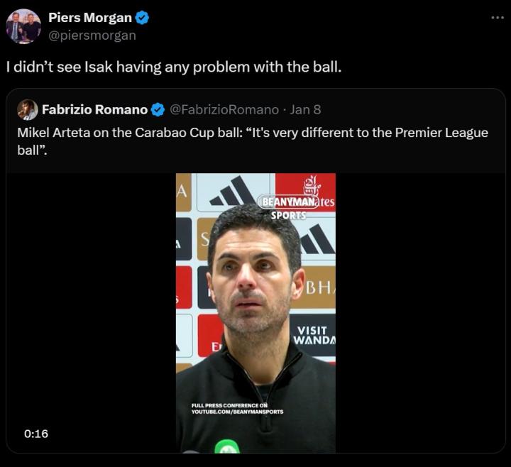 在英联杯半决赛首回合,阿森纳在主场0-2不敌纽卡斯尔联,枪手主帅阿尔特塔赛后谈到了比赛用球的影响,对此著名枪手球迷摩根表示不解。
