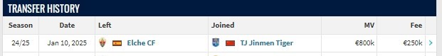 北京时间1月10日,根据德国转会市场网站更新的数据显示,埃尔切中场克里斯蒂安-萨尔瓦多转会加盟天津津门虎,转会费25万欧元。