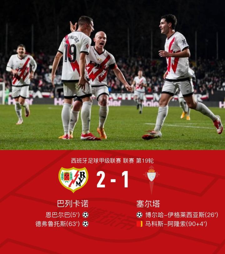 巴列卡诺2-1塞尔塔,恩巴尔巴先拔头筹,德弗鲁托斯制胜