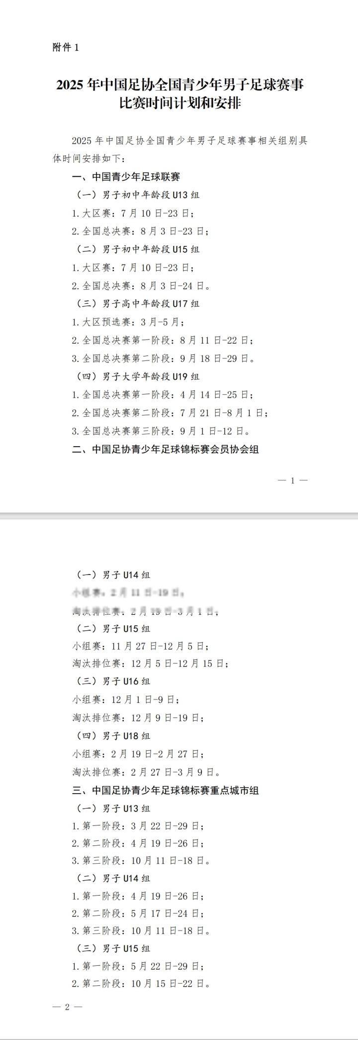 1.2025年中国足协全国青少年男子足球赛事比赛时间计划和安排