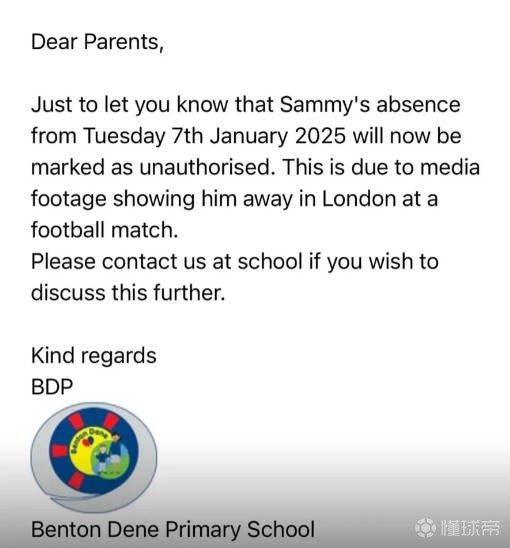 萨米就读的本顿-丹尼小学在电子邮件中表示:“通知您一下,萨米2025年1月7日星期二起的缺席将被标记为未经授权,这是因为媒体镜头显示他在伦敦参加了一场足球比赛,如果您希望进一步讨论,请联系学校。”