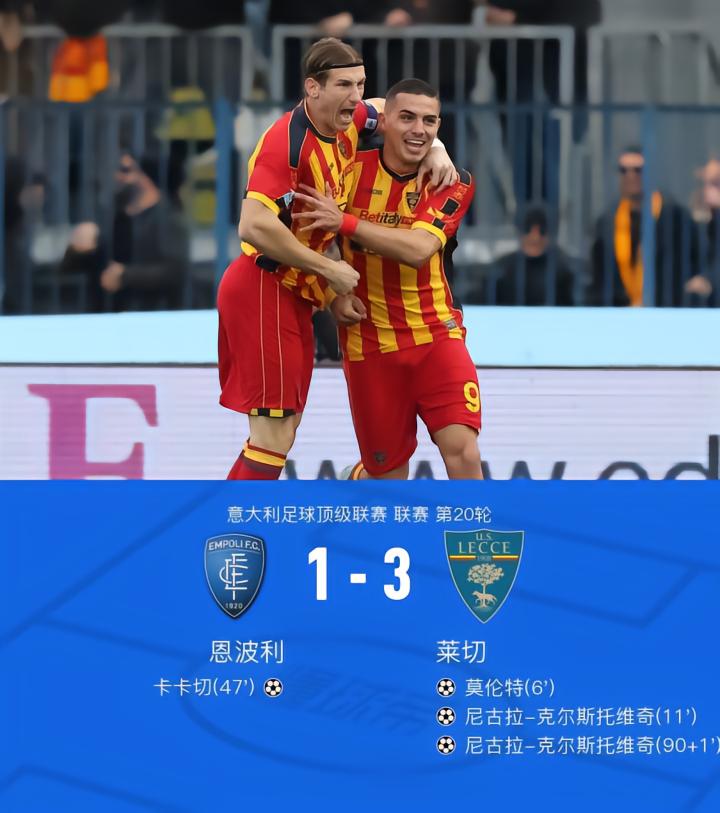 莱切客场3-1恩波利,莫伦特开场闪击破门