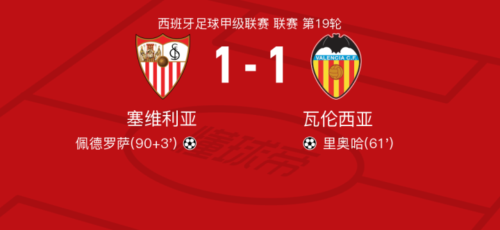 北京时间1月12日塞维利亚vs瓦伦西亚,佩德罗萨得到全场最高的7.7分,赫苏斯-巴斯克斯得到全场最低的5.5分