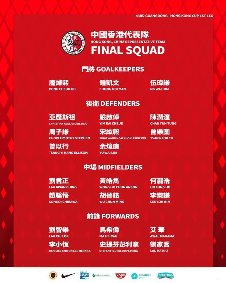 北京时间1月12日消息,中国香港足总于1月10日公布了省港杯23人大名单。