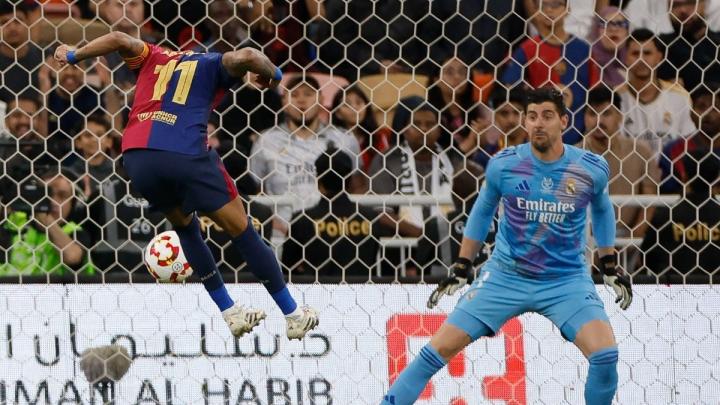 虽然皇马开场仅5分钟就由姆巴佩首开记录,但此后他们遭遇崩盘,被巴萨由亚马尔、莱万多夫斯基、拉菲尼亚和阿莱士-巴尔德连续打进4球。