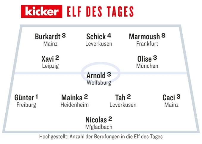 在德甲第16轮比赛结束后,《踢球者》杂志评选了本轮比赛日的最佳阵容。