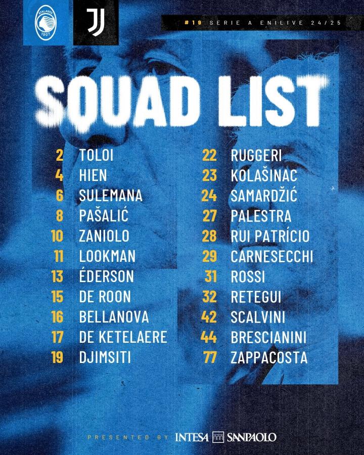 北京时间1月15日03:45,亚特兰大将在意甲第19轮补赛主场迎战尤文图斯。亚特兰大方面公布了球队此役的大名单,卢克曼领衔,雷特吉伤愈回归。