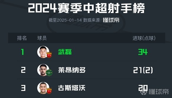 2024赛季中超联赛射手榜——武磊以34球居首,莱昂纳多21球排名第二,古斯塔沃20球位列第三。