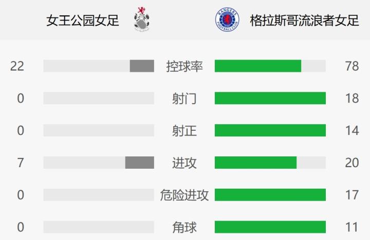值得一提的是,客队格拉斯哥流浪者女足本场比赛一共完成了18脚射门,其中14脚射正,打进14粒进球。而主队女王公园女足则未获得射门机会。