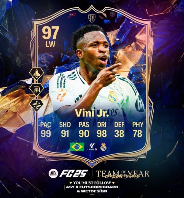 维尼修斯的总评为97分,金特技为火箭、搓射和游龙盘带,这也是他职业生涯首次入选FC的年度最佳阵容。