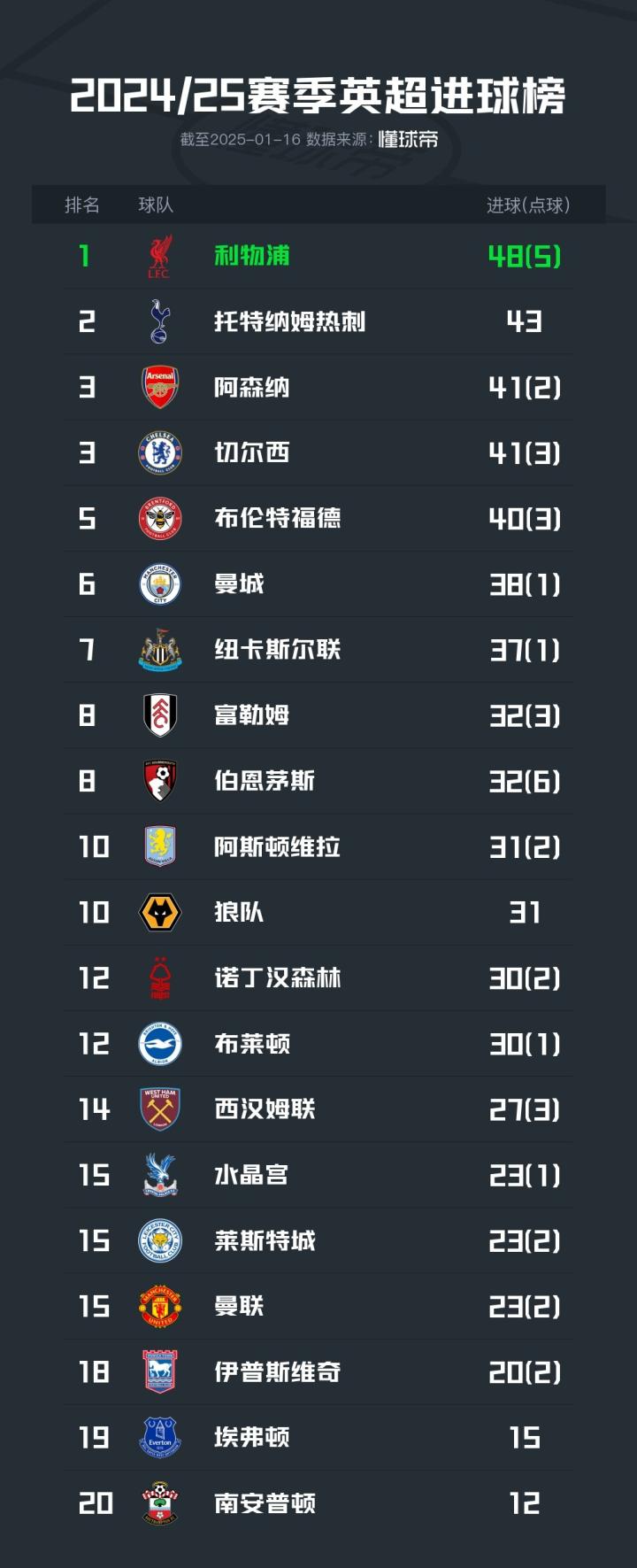 切尔西排名英超第5,布伦特福德排名英超第10,而进球数排名榜单第7的热刺排在联赛第13位。
