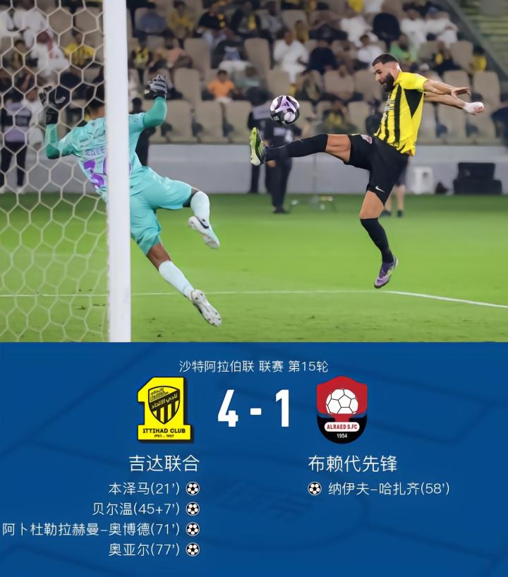 吉达联合4-1布赖代先锋,本泽马1射2传,奥亚尔、贝尔温传射