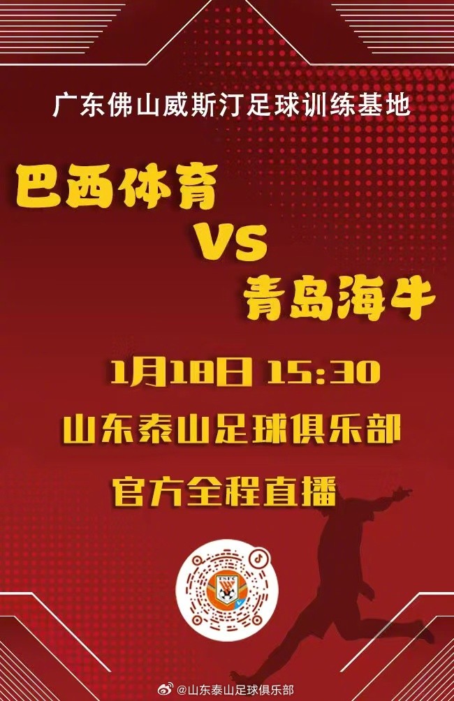 1月17日,山东泰山官方发文表示,巴西体育将在1月18日下午15:30与青岛海牛进行友谊赛。