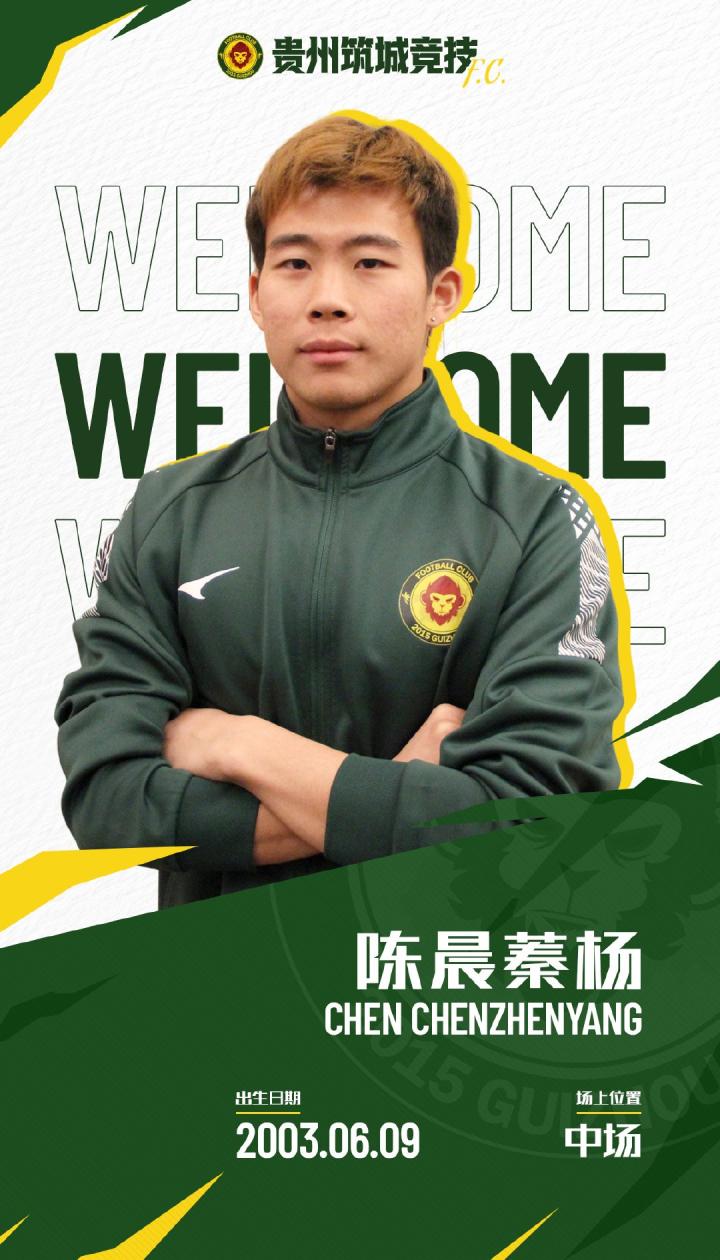 贵州筑城竞技官方宣布,云南玉昆中场陈晨蓁杨正式加盟球队。