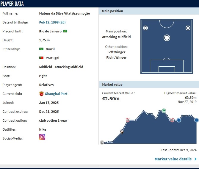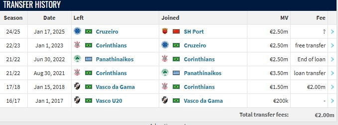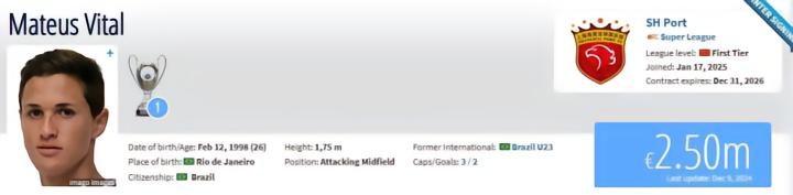 德转显示,维塔尔与上海海港签署了一份年限为2+1的合同,俱乐部拥有续约选择权。目前,球员的转会费暂未显示。