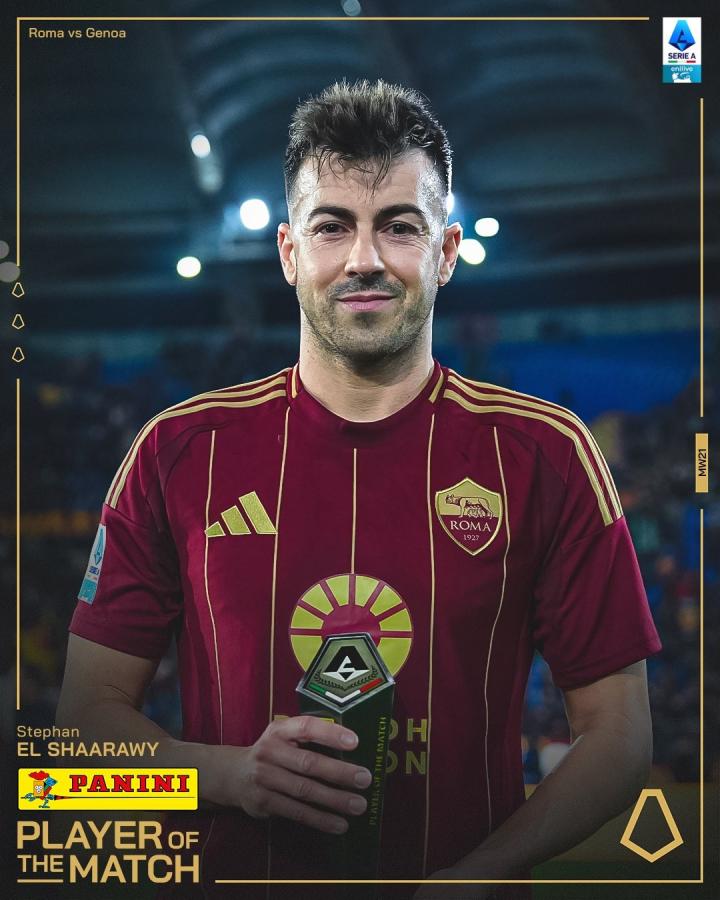官方消息,沙拉维当选罗马对阵热那亚一役全场最佳。
