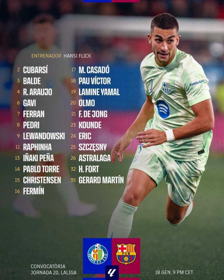 巴萨官方公布了西甲第20轮客场对阵赫塔费的比赛大名单,莱万领衔,克里斯滕森回归,法蒂继续缺席。比赛将于北京时间1月19日凌晨4点进行。