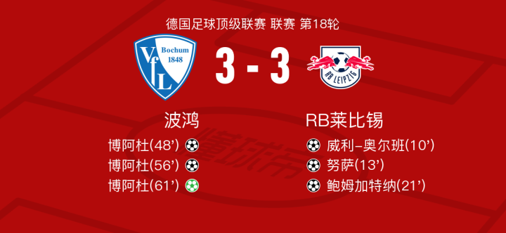 北京时间1月18日波鸿vsRB莱比锡,博阿杜得到全场最高的8.9分,德雷维斯得到全场最低的5.7分