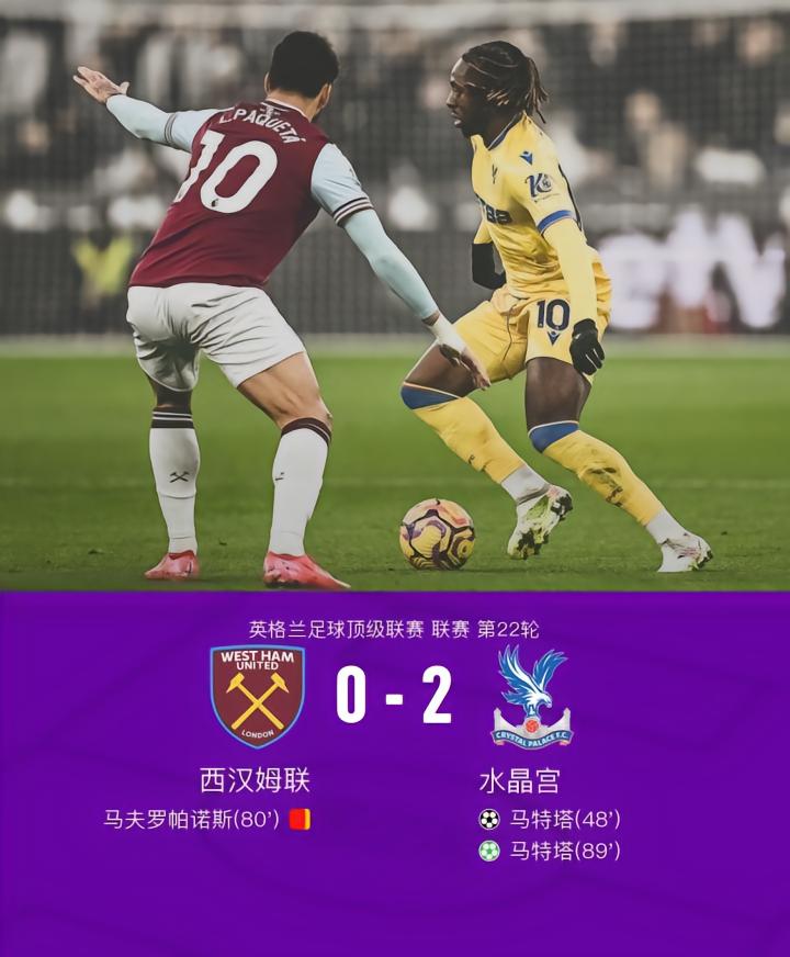 水晶宫客场2-0战胜十人西汉姆联,马特塔双响,马夫罗帕诺斯染红