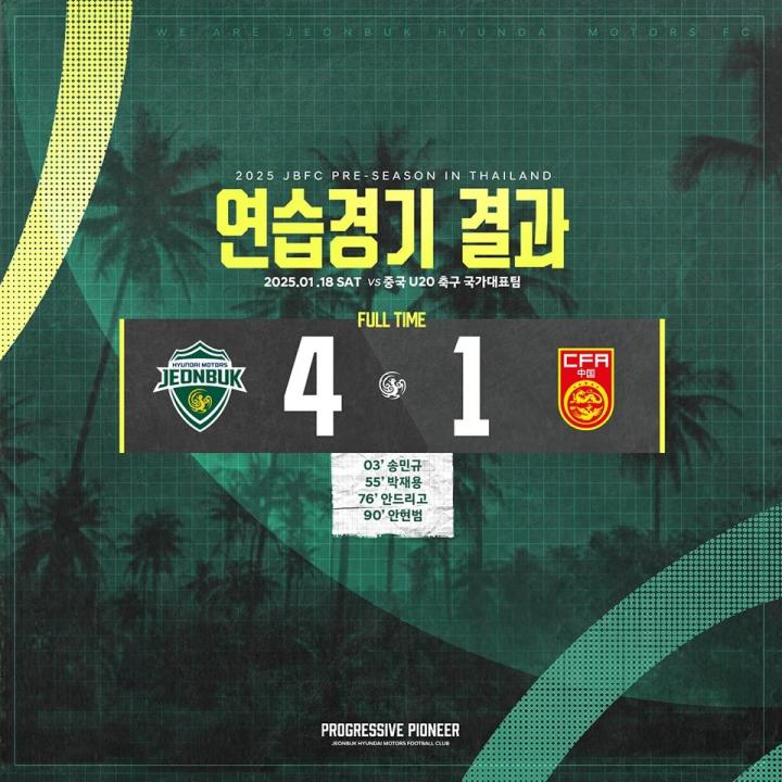 北京时间1月18日下午5点,正在泰国拉练的中国U20与韩国的全北现代进行了一场友谊赛,据现场记者马德兴消息,本场比赛最终比分为U20国青1-4全北现代。