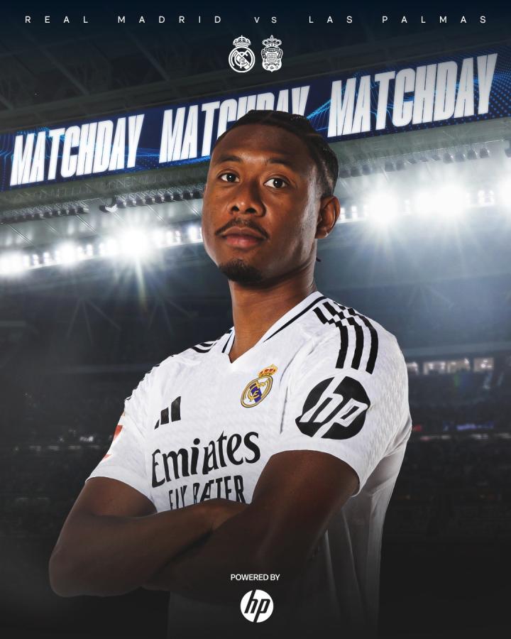 皇家马德里发布联赛对阵拉斯帕尔马斯海报,球队后卫阿拉巴单人出镜。