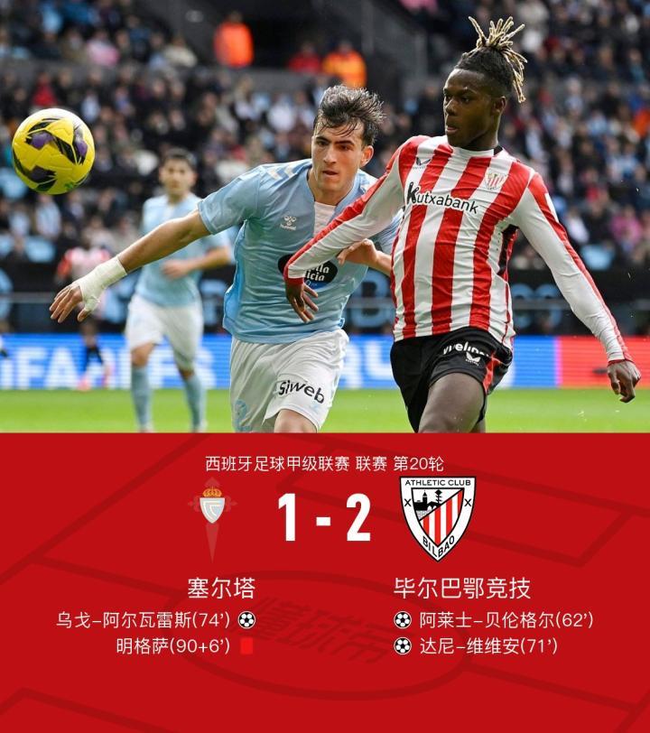 毕尔巴鄂竞技2-1客胜塞尔塔,贝伦格尔破门,维维安建功