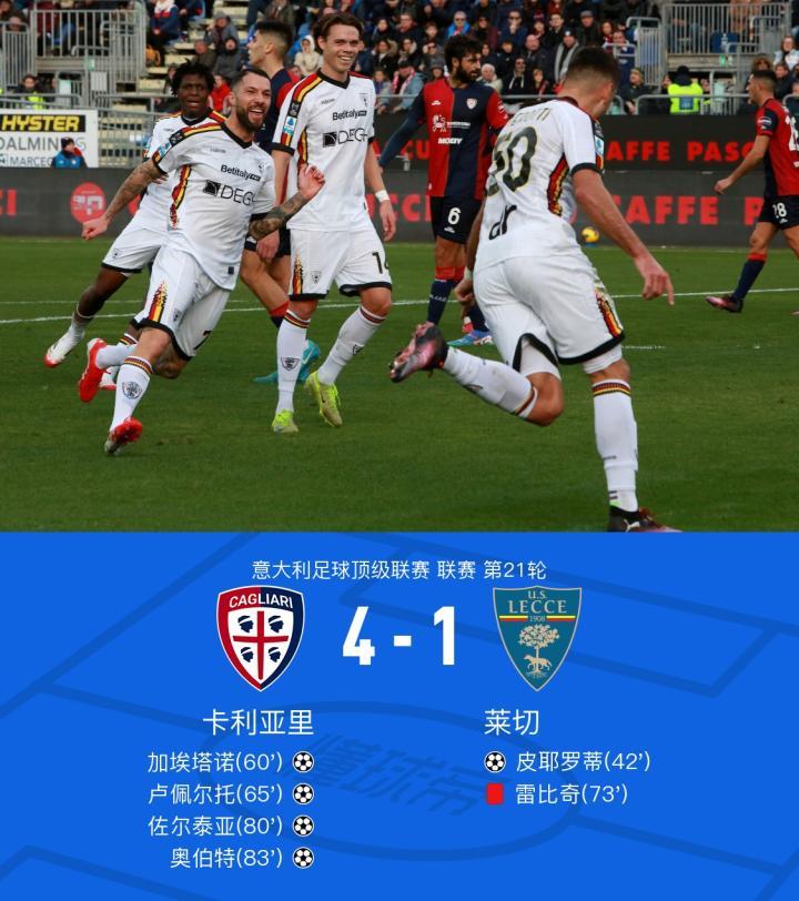 卡利亚里4-1逆转十人莱切,加埃塔诺、卢佩尔托破门佐尔泰亚、奥博特建功,雷比奇染红