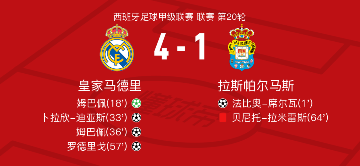 北京时间1月19日皇家马德里vs拉斯帕尔马斯,姆巴佩得到全场最高的10分,贝尼托-拉米雷斯得到全场最低的4.8分