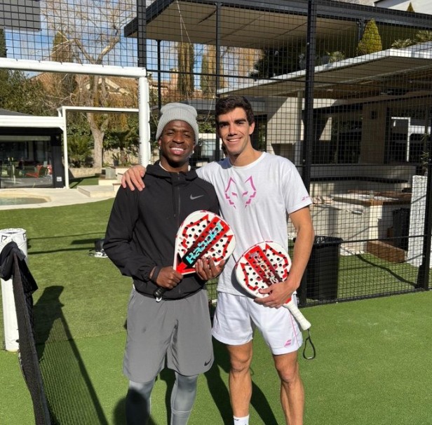 这个周末,维尼修斯与西班牙板式网球界的明星胡安-勒布朗一起打球。后者在社交媒体上分享了一张与维尼修斯的合照,照片中两人手持安达卢西亚人最新款的球拍,并附上了文字:“打得不错,朋友”。维尼修斯回复道:“不错嘛”。