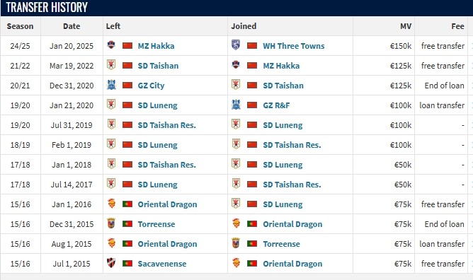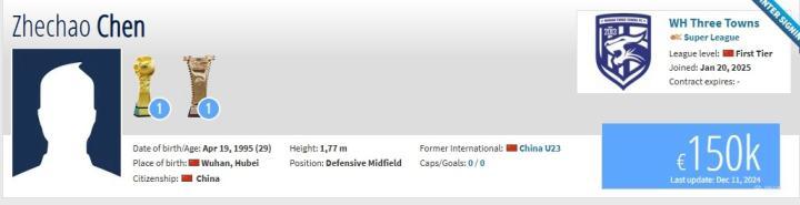 德转显示,陈哲超为自由身加盟武汉三镇,目前球员的身价为15万欧元。