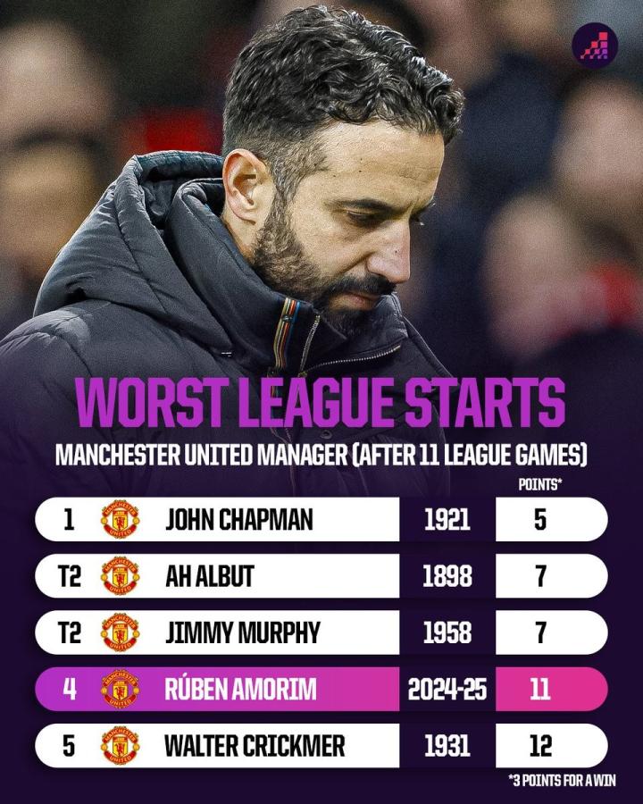 阿莫林在输给布莱顿的赛后新闻发布会上表示“现在可能是有史以来最差的曼联”,据Opta统计,阿莫林是曼联队史执教球队前11场联赛成绩第四差的主帅。