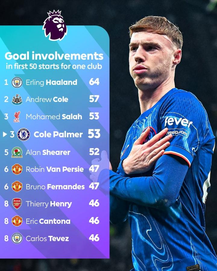 据英超官方统计,帕尔默代表切尔西英超50次首发直接参与53球,在英超历史代表单一球队前50次首发参与进球榜上,帕尔默排名第三,仅次于哈兰德和安迪-科尔。