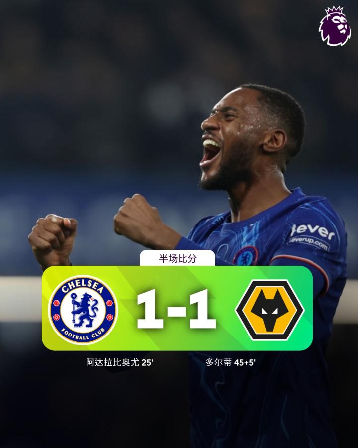 此役主场对阵狼队,切尔西凭借阿达拉比奥尤的进球取得1-0领先,上半场补时阶段,切尔西被狼队后卫多尔蒂攻破球门,比分被扳平。