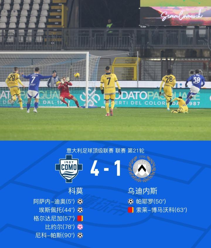 科莫4-1乌迪内斯,双方各一人染红,埃斯佩托传射,帕斯建功